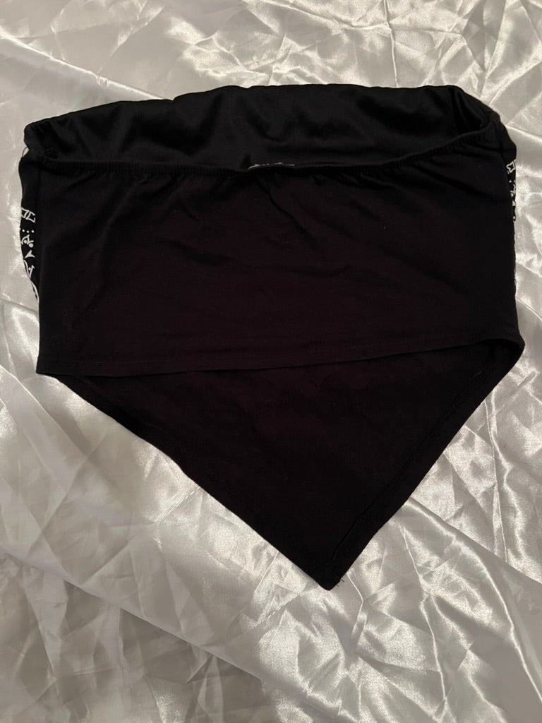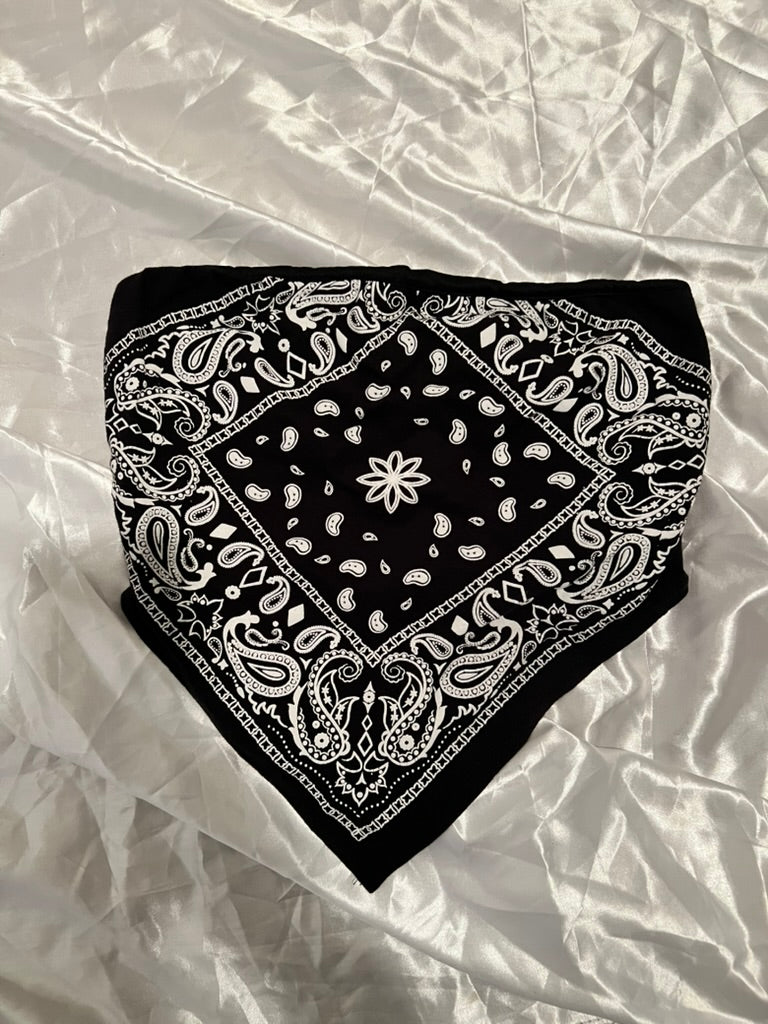Black & white paisley bandana tube top with a stretchy back and pointed hem. Soft knit interior, easy summer piece, and great for layering.