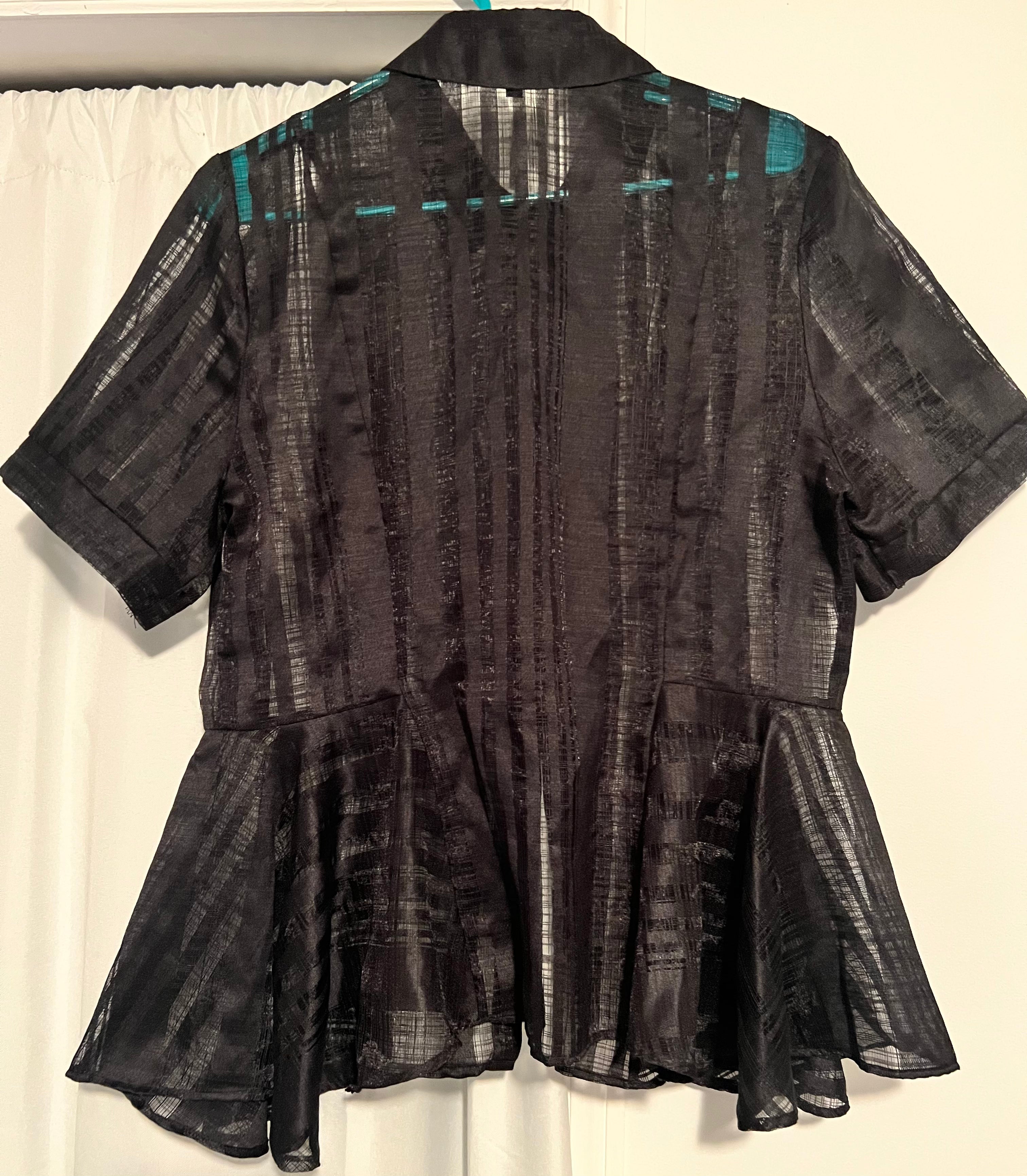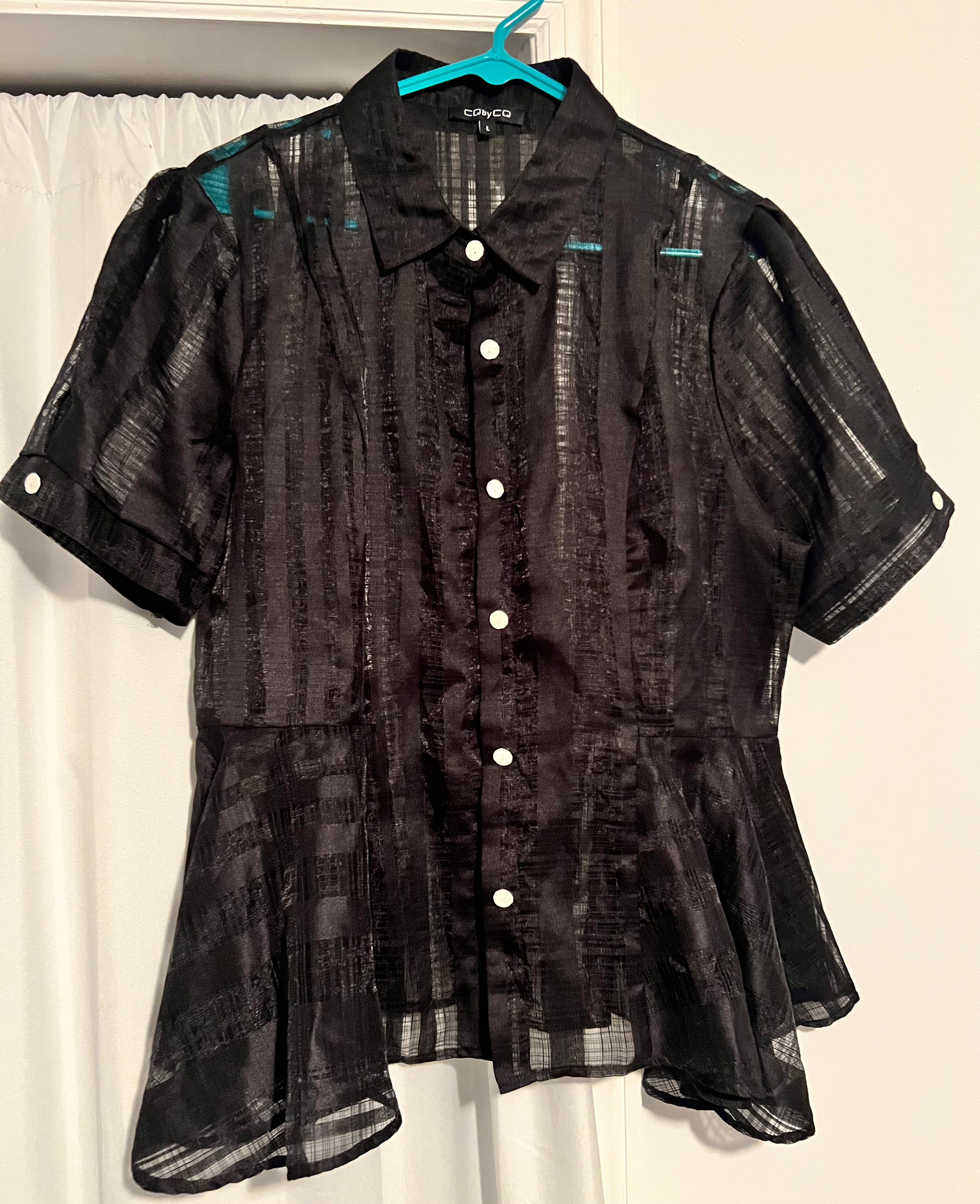 CQ by CQ Black Sheer Blouse Women’s Size L Short Sleeve Button Down Peplum Hem