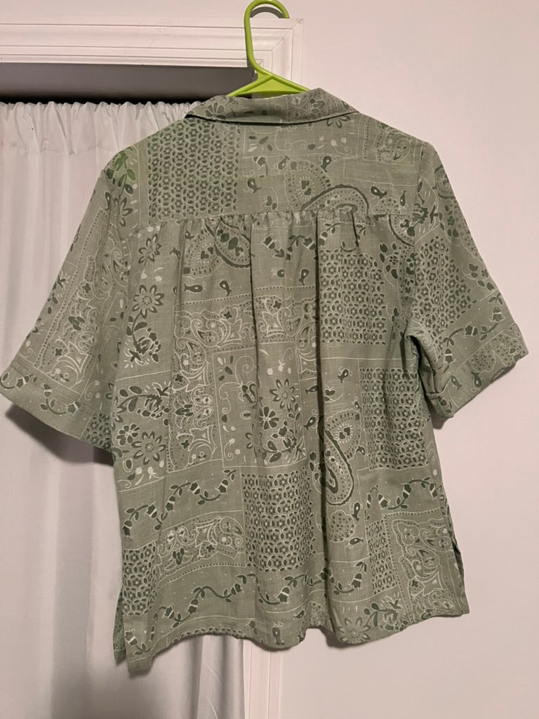 A soft, easygoing sage-green button-up featuring an allover bandana-inspired print. Lightweight and breathable with a relaxed, slightly boxy silhouette — perfect worn open over a tank, tucked into trousers, or styled oversized for that effortless vintage look. Made from a comfy poly–cotton blend and in excellent condition.