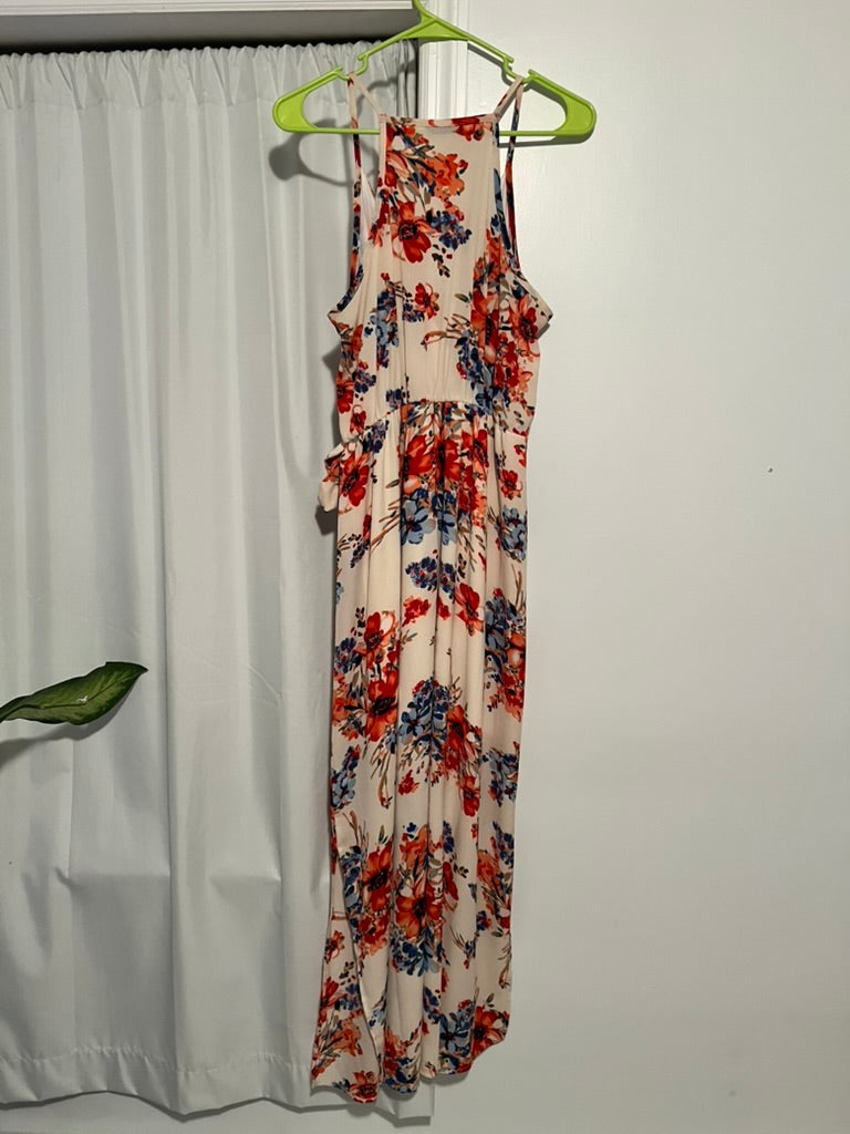 A soft and flowy floral maxi dress featuring a wrap-style front, adjustable spaghetti straps, and a matching tie belt at the waist. The cream base is covered in vibrant red, blue, and peach florals — perfect for spring, summer, or vacation looks. Fully lined and made from lightweight 100% polyester for a breezy, comfortable fit.