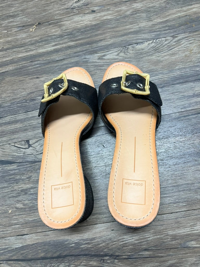 Minimal and versatile Dolce Vita slide sandals in black with a gold-tone buckle detail. Easy slip-on style that works for everyday wear, vacations, or dressing up a casual outfit.