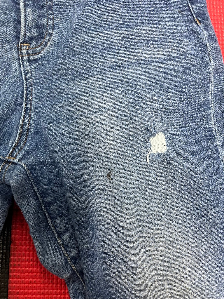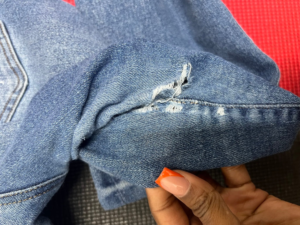 A classic pair of medium-wash slim jeans with light distressing that gives them an easy, lived-in vibe. Features a flattering super high-rise fit, subtle rips at the knee, and gentle fading throughout. There’s a small mark on the front and minor wear near the hem—still super wearable and perfect for everyday styling.