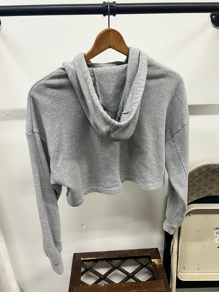 Soft and cozy cropped hoodie from Flirtitude Active in classic heather gray. Features a fleece-lined interior, relaxed drop shoulders, and adjustable drawstrings. Perfect for workouts, lounging, or casual athleisure outfits. In Very Good condition with no stains or major wear.