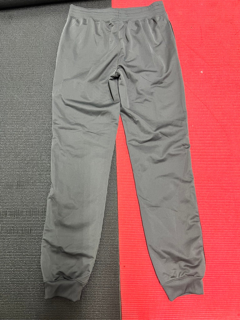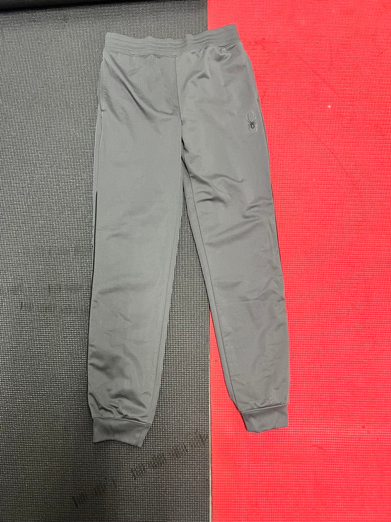 Lightweight gray Spyder joggers with a slim athletic fit. Features include an elastic waistband, cuffed ankles, and a subtle black Spyder logo at the hip. Soft, comfortable, and perfect for workouts, errands, or everyday wear. In Good condition with no stains or damage — just normal wrinkling from storage.