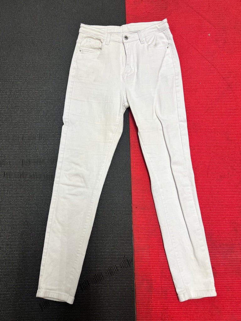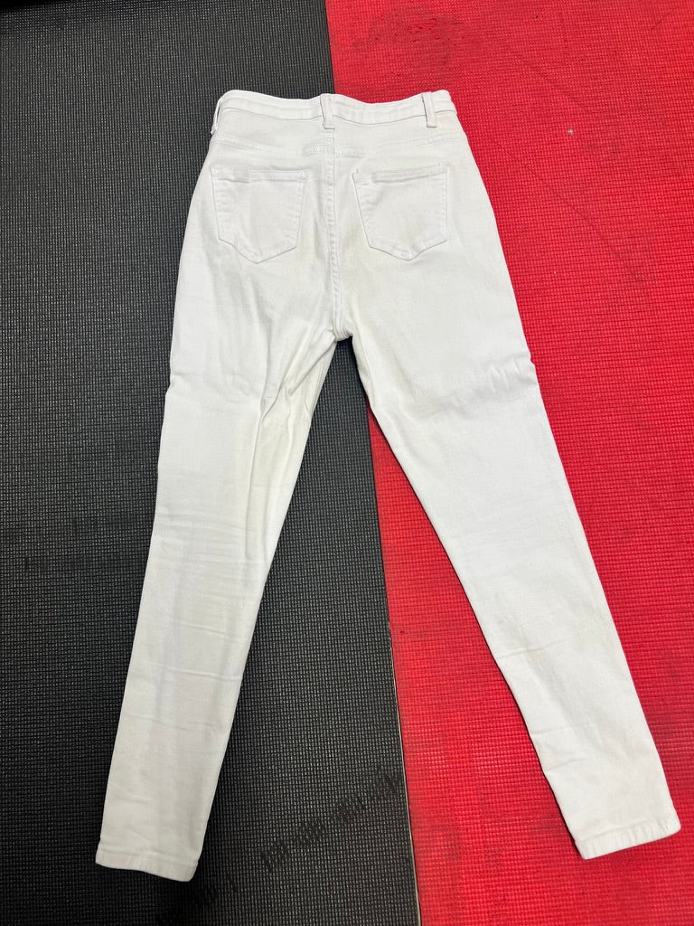 White skinny jeans from Shein featuring classic five-pocket styling and a high-rise fit. These jeans show visible discoloration and small stains, especially on the thigh and hip area, with light wear throughout. No holes or major damage. Still great for casual wear, DIY projects, or styling with longer tops. Priced low due to condition.