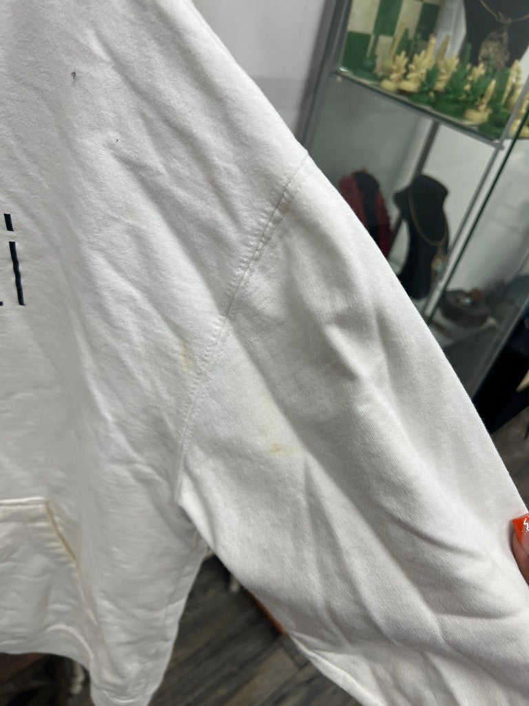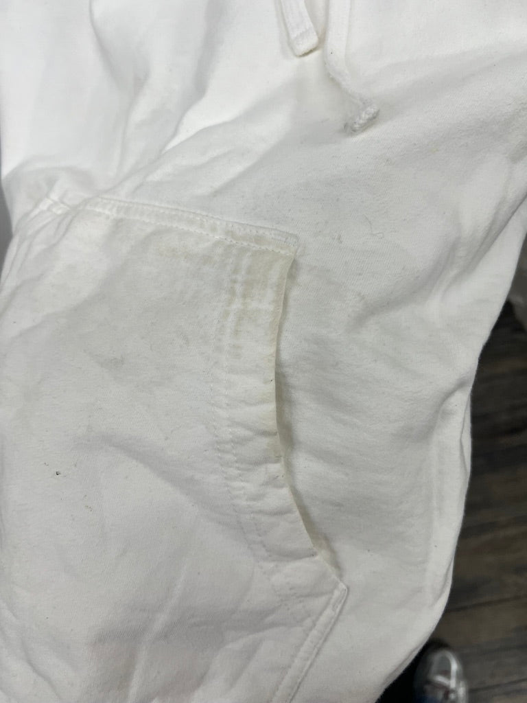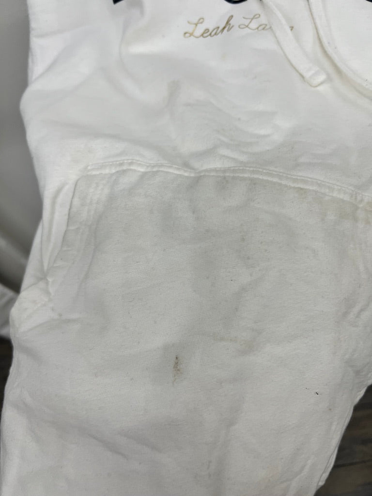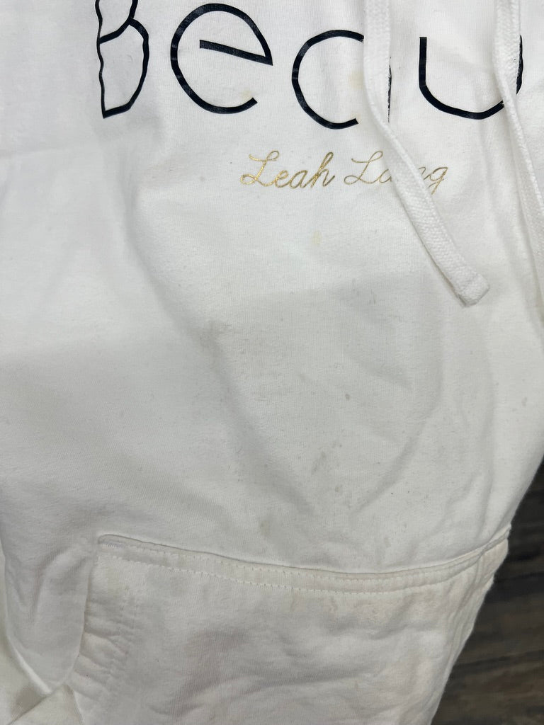 White “Beauti – Leah Lane” hoodie with a relaxed fit and classic kangaroo pocket. This piece shows significant wear, including visible stains on the front, pocket area, and sleeve, plus general dinginess from wash and use. Perfect for at-home lounging, crafting, or wear-and-tear activities. Priced at a low point due to condition.